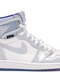 This Jordan 1 Retro High consists of a white leather upper with a mixture of mesh, patent leather, and translucent TPU overlays. An icy outsole, blue interior, and Zoom branding above the Swoosh completes the design.