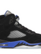 In a style similar to classic Jordan 5s of the past, the Air Jordan 5 Racer Blue features a black Durabuck upper with signature TPU netted inserts and a reflective padded tongue. At the base, Racer Blue accents pop against a black midsole and icy translucent sole.