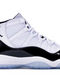 This 2018 Air Jordan 11 for grade-schoolers boasts the same design hallmarks as its full-sized counterpart, starting with the ballistic mesh upper in white. The upper transitions to a black patent leather mudguard, which then gives way to a translucent rubber outsole fitted with the Concord herringbone-tread inserts that give the shoe its name.