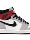 The Jordan 1 High Light Smoke Grey is composed of a white leather upper with grey suede overlays and a red leather ankle panel. Black suede on the heel paneling and Swoosh, a white midsole, and black outsole completes the design.